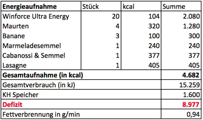 Die Energiebilanz* weist – sehr ähnlich zu Hitzendorf 2013 – ein Defizit von rund 10.000kcal auf. Die fehlenden Kalorien können nur aus der Fett- oder Eiweißverbrennung gekommen sein. Ein Blick auf die Körperanalysewaage bestätigt das: ~800g-1.000g Fett fehlen. Mit einer gesteigerten Nahrungsaufnahme wäre hier noch viel Luft nach oben, v.a. im Bereich der Kohlenhydratzufuhr. Allerdings hätte dann wieder die Gefahr bestanden, dass es mir – wie beim RATA – den Magen umdreht. Was mir in Kaindorf in jedem Fall zu Gute gekommen ist, ist dass es eher kühl war und v.a. die intensive Startphase am Abend war. So musste ich nicht viel Wasser trinken und habe auch nicht übermässig viel Mineralstoffe (Salz) verschwitzt.