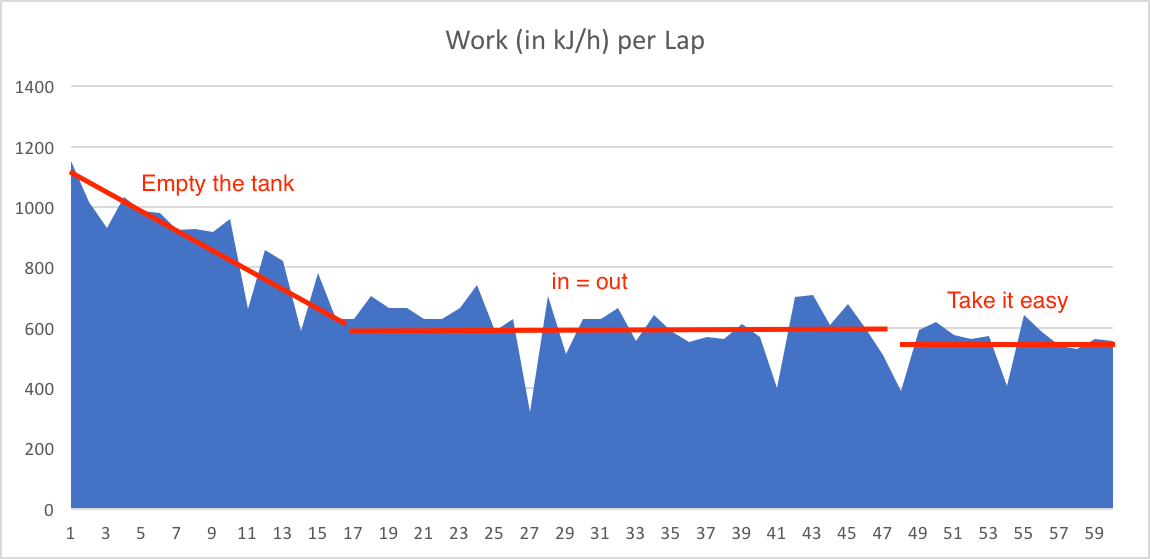 Die Taktik war von Anfang an zu versuchen möglichst den Windschatten von Staffeln auszunutzen. Das bringt einen im Flachen am schnellsten weiter, bedingt aber auch, dass man am Berg ordentlich hinhalten muss. In den ersten ~20 Runden sprangen im Windschatten der 10er Staffel meiner Teamkollegen 18-20 Minuten Runden heraus. Dafür waren aber an die 300W NP pro Runde notwendig. Nach 3,5h wechselte ich auf langsamere Staffeln. Die Speicher waren bis dahin schon ziemlich leer gefahren und ich konnte bzw. durfte nur mehr so viel „verfahren“ wie ich auch an Energie zu mir nahm. 600 kJ/h (~166W Dauerleistung) war offenbar die Grenze, die ich bis auf die letzten 10 Runden, in denen ich dann bewusst nur mehr locker gefahren bin, recht konstant gehalten habe.