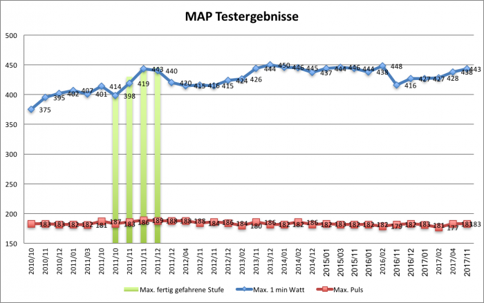 Die Ergebnisse der MAP Tests, die ich von Anfang an in unregelmäßigen Abständen durchführe, bestätigen das oben angeführte. Seit 2013 bin ich von der Endleistung quasi auf dem gleichen Niveau. Voriges Jahr bzw. heuer im Frühjahr erstmals niedriger. Allerdings bin ich die Tests meist im Winter gefahren, wo ich in den letzten Jahren durch den intensiveren Trainingsplan auf die abschließenden, schmerzhaften Minuten des Tests besser vorbereitet war.