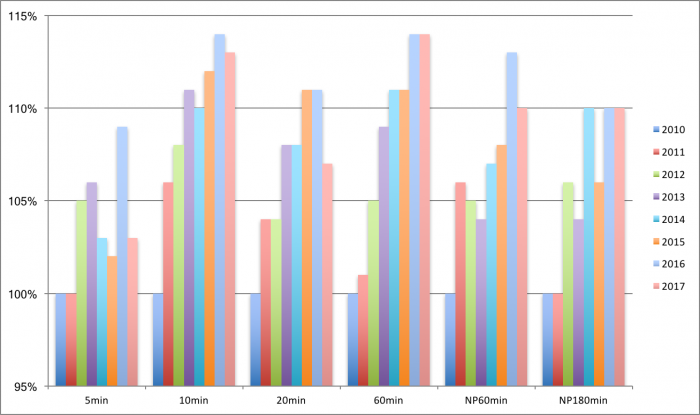 Das Mean-Max Chart spricht eine recht deutliche Sprache: Nach 7 Jahren gezieltem Ausdauertraining ist es vorbei mit großartigen Verbesserungen. Mit einer maximalen Stundenleistung von ~335-340W bin ich an der Grenze des – mit meiner (genetisch vorgegebenen) Vo2max von ~70-72 ml/min/kg – Möglichen angekommen. Hinzu kommt, daß das Alter zunehmend an den Kräften zehrt. Ich merke es zwar noch nicht an der Vo2max, die ab 35 Jahren zu sinken beginnt, aber an den Erholungszeiten, die merkbar länger werden. Entsprechend vorsichtiger werde ich auch mit dem Wintertraining. Es gibt kaum mehr etwas zu gewinnen, aber viel zu verlieren (= Überlastung, Burn-out o.ä.).