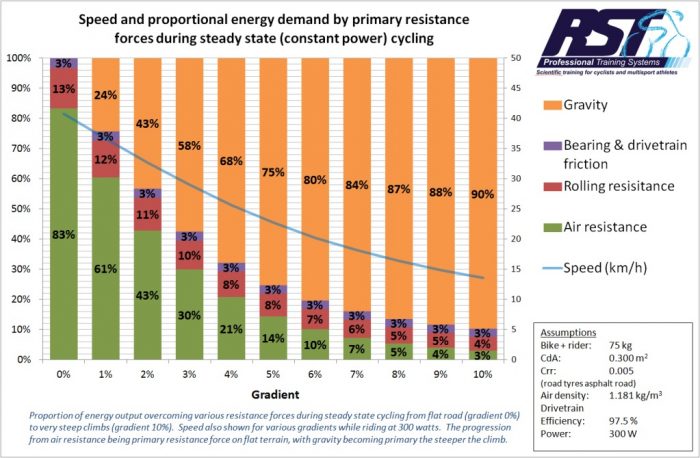 Einfluss von Schwerkraft, Luftwiderstand und Rollwiderstand auf die Geschwindigkeit bei unterschiedlichen Steigungen