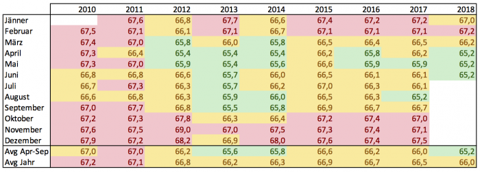 Ende 2011 habe ich begonnen mich mit dem Thema „ideales Renngewicht“ zu beschäftigen und im Frühjahr 2012 erstmals umgesetzt. 2013 war bisher das Jahr mit dem durchgängig niedrigsten Gewicht, v.a. getrieben durch Transalp (Juni), Hauteroute (August), 24h Hitzendorf (September). 2015 habe ich mich am Duathlon versucht und dadurch an Gewicht zugelegt. Gleichzeitig war es aber auch mein erfolgreichstes Jahr (Amateurmeister EZF, Vizemeister Strasse). 2016 & 2017 schaffte ich es kaum mehr unter 66kg, daher habe ich 2018 ein paar Veränderungen vorgenommen. Dazu später mehr, zunächst aber ein paar Learnings aus den Jahren davor: