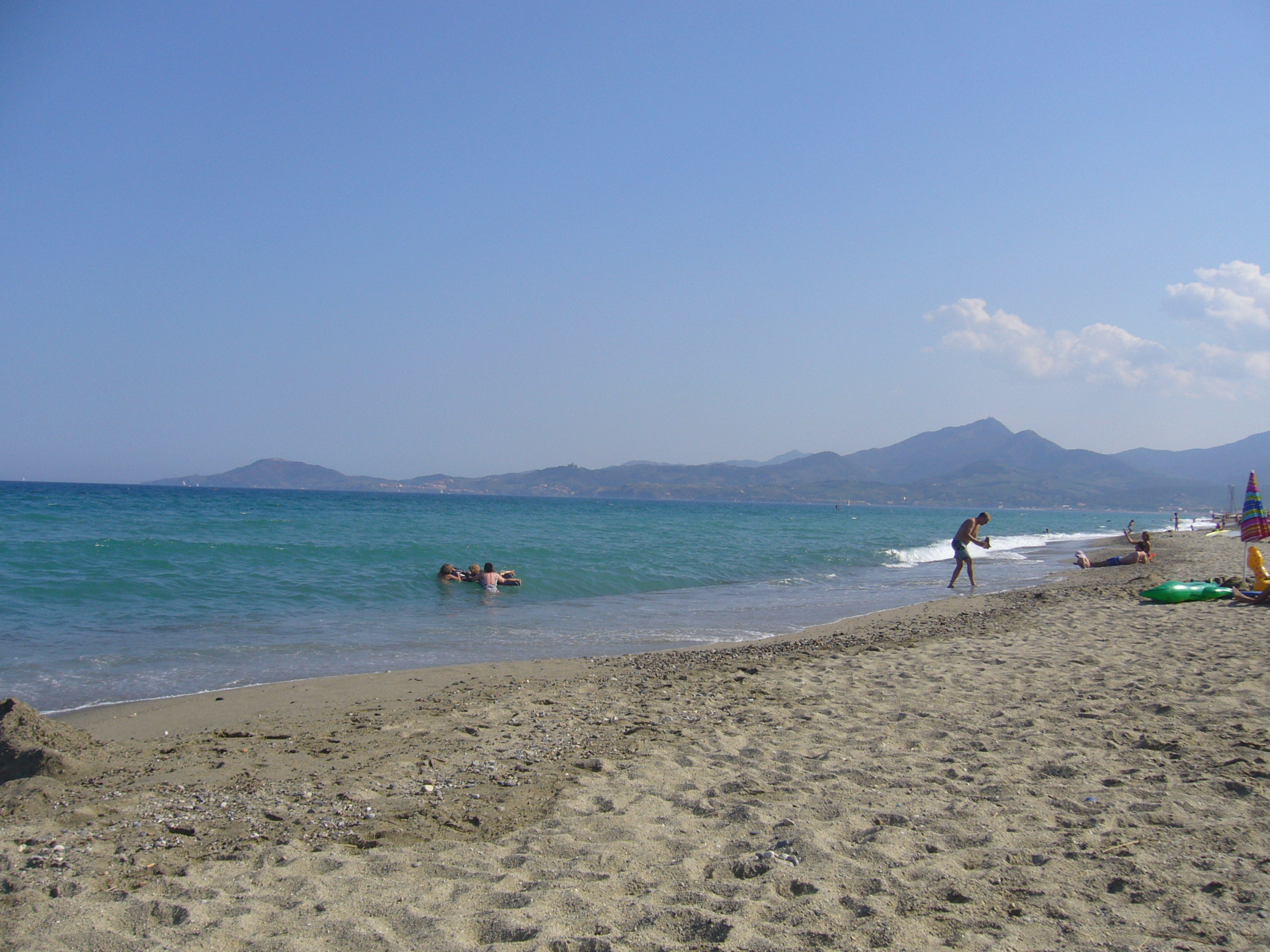 Am Strand von Argeles sur Mer – auf dem höchsten Berg im Bild steht der Tour de Madeloc