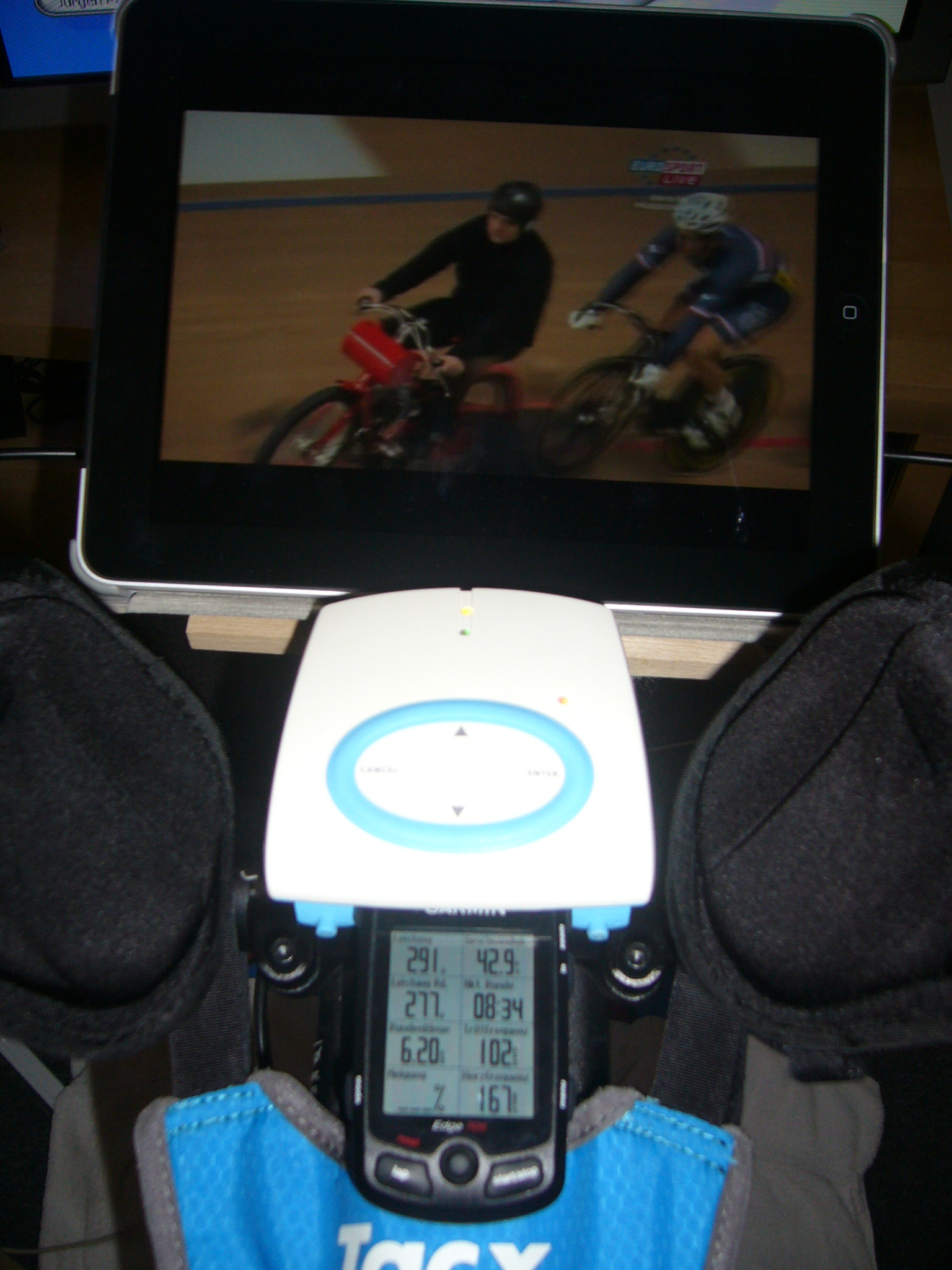 Heuer habe ich mein Setup um ein iPad erweitert, das sich über eine „Aufliegerhalterung“ perfekt in das Cockpit neben Edge 705 und Tacx Controller einfügt und auf dem ich – je nach Trainingsintensität – lese, fernschaue (über Eye-TV) oder Musik höre. Der Ton wird via AirPlay & Airport Express an Lautsprecher unter dem Fernseher ausgegeben.