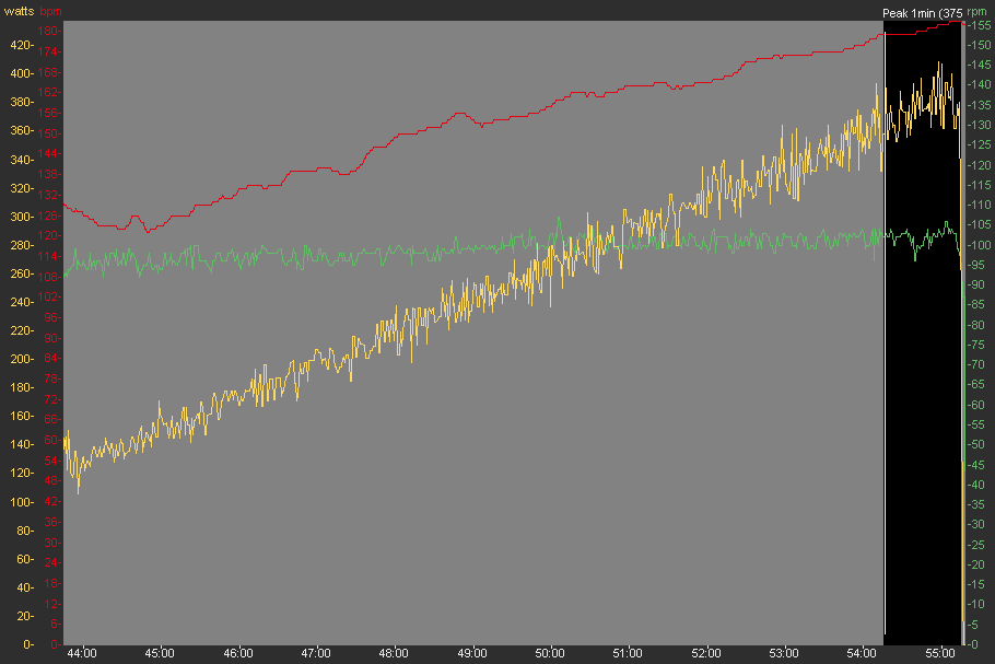 Rot = Puls, Gelb = Leistung in Watt, Grün = Kadenz, 1min Max = 375W