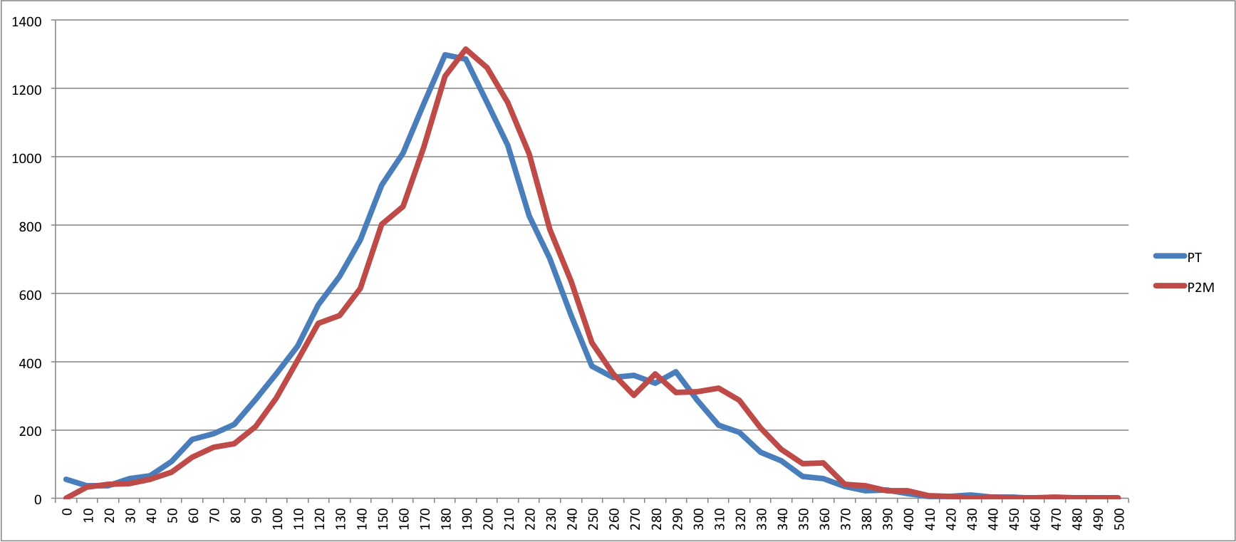 Time in Zone (X-Achse = 10 Watt Blöcke, Y-Achse = Zeit in Sekunden):