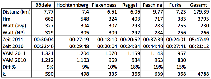 Die Steigerung im Vergleich zum Vorjahr ist vor allem auf den 3 letzten Bergen beachtlich. Offenbar macht sich hier die hohe CTL bezahlt bzw. zeigt sich recht deutlich, dass die Leistung an der Schwelle und wie lange man diese halten kann sehr gut trainierbar ist, während ich mich im kürzeren, hochintensiven und hauptsächlich durch die Vo2Max limitierten Bereich wesentlich weniger gesteigert habe.