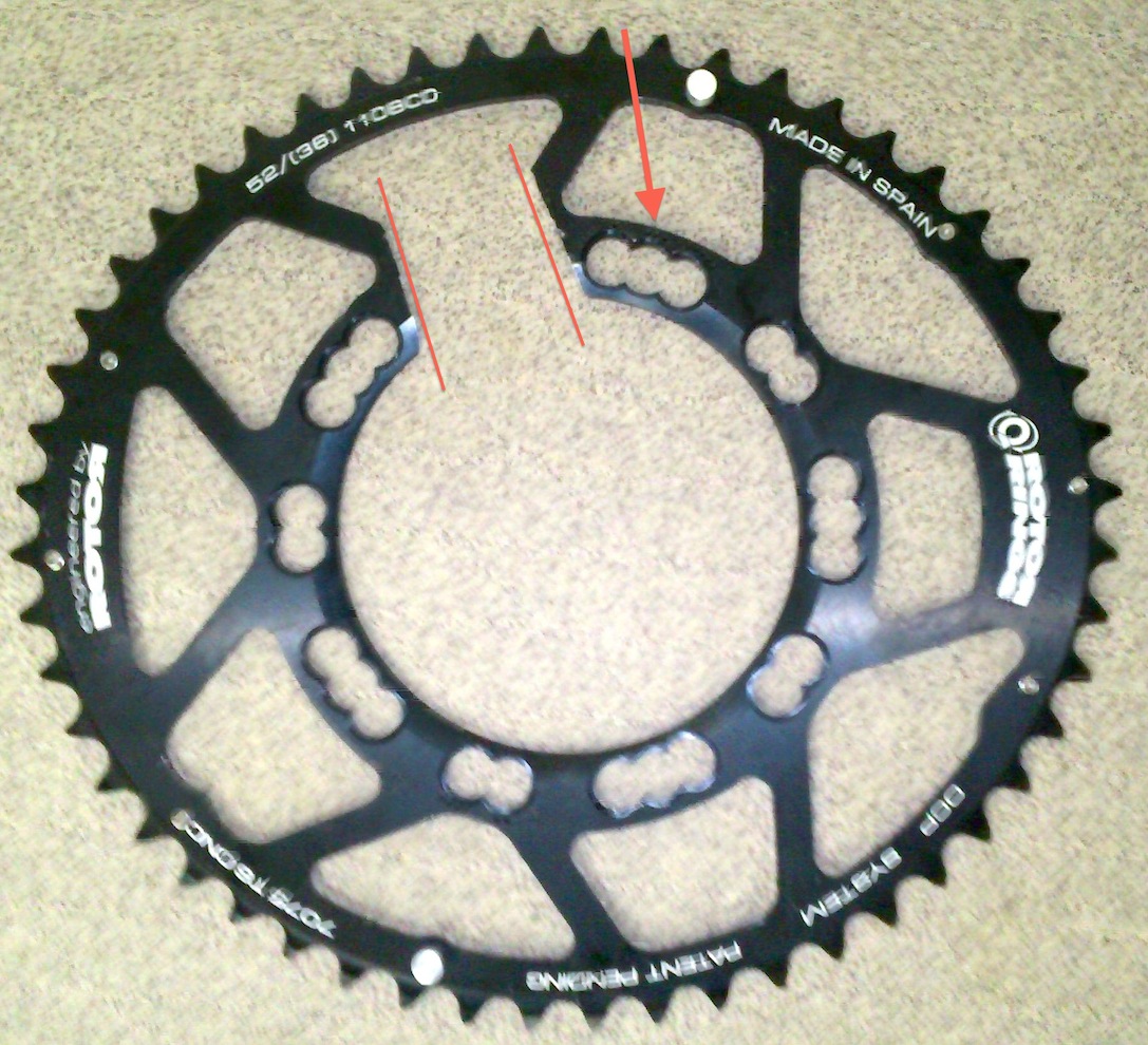 Modifizierte Q-Rings 52 Zähne/110mm: Der Spalt muss ca. 3,5cm breit sein und links neben dem Loch mit den 3 Punkten angefertigt werden. Eine andere Einstellung als Position 3 ist nicht möglich.