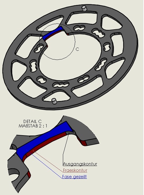 Modifizierter Q-Ring mit 52 Zähnen. Der Ausschnitt muss ca. 3,5cm breit sein und links neben dem Loch mit den 3 Punkten angefertigt werden. Eine andere Einstellung als Position 3 ist nicht möglich.