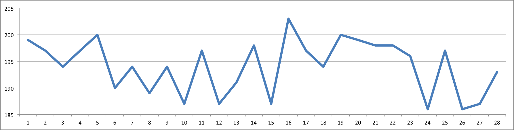 - Technisches Learning 2 – Autozero vom Powertap ist kritisch: Hatte ich mich vor 2 Jahren noch darüber geärgert, dass die Fortius Rolle an manchen Tagen mehr und an manchen weniger „anlegt“, so weiss ich mittlerweile, dass die Fortius Rolle trotz der heftigen Temperaturdrift sehr konstante Werte einstellt, aber falsche Auto-Zeros beim Powertap zu Abweichungen führen. v.a. der Zwang vor den Catalyst Workouts die Geschwindigkeit auf 0 zu stellen (= aufhören zu treten, ausrollen lassen, warten bis das Laufrad steht, warten bis 5 sek runtergezählt sind, Training beginnen) erzwingt an dem Punkt ein Auto-zero, das mit leider recht grosser Wahrscheinlichkeit daneben geht. Ich habe daher von allen Trainings die letzte Minute vor dem ersten 20min Intervall herausgesucht und diese miteinander verglichen. Man sieht an der Grafik unten, dass es Schwankungen von bis zu 15W gibt. Ein neuerliches Auto-Zero des Powertaps (= voll antreten und das Rad danach ausrollen lassen) hat die Probleme meistens behoben. Für den Vergleich der 2×20 Einheiten (Grafik oben), habe ich diese Unterschiede normalisiert, d.h. die Wattwerte der Intervalle mit den Unterschieden beim Warm-up gegengerechnet. Nur so ergibt die Grafik überhaupt einen Sinn.