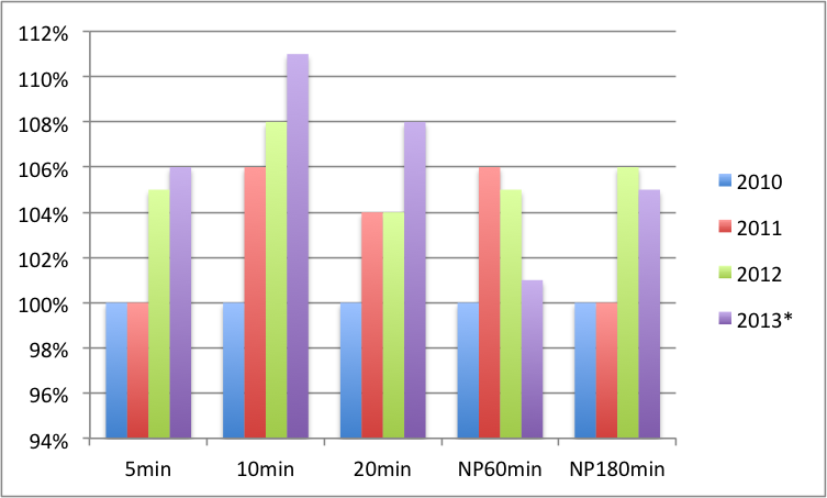 Meine Leistungsentwicklung im Vergleich zu 2010 (1. Trainingsjahr). 2013 ist nur bis Juli berücksichtigt (und es hat noch keine harten NP60-180 Rennen gegeben).