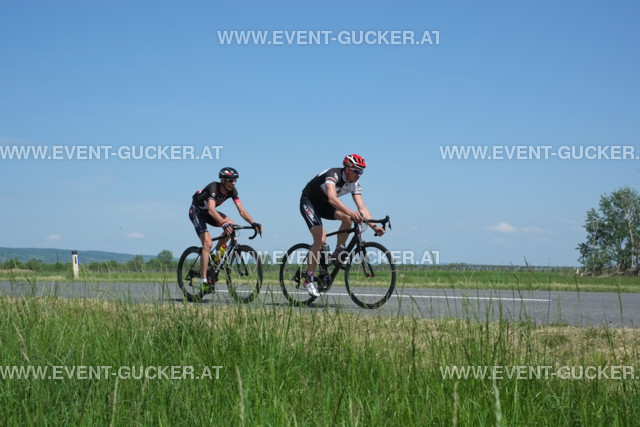 Gibt’s doch nicht, dass wir das durchbringen? Was blieb uns anderes übrig als es zu probieren. Also sind wir auf Zug weitergefahren. Christian war schon ziemlich fertig, gab aber sein Bestes. Mir gingen schön langsam auch die Kohlenhydrate aus – für ein 3h Zeitfahren hatte ich nicht die notwendige Menge an Gels mitgenommen. Trotzdem lief es nach wie vor sehr gut, kein Verfolgerfeld in Sicht, die Kilometer zum Ziel wurden immer weniger und der Schnitt in der 3. Rennstunde immer noch über 40km/h. Richtig hart wurde es dann auf der letzten Passage nach Mörbisch. Steifer Gegenwind blies uns ins Gesicht. Beide schon ziemlich ausgelaugt kämpften wir uns dahin. Als wir uns nach Rust zum ersten Mal gemeinsam umdrehten und hinter uns immer noch keine Meute herannahen sahen, war uns klar, dass wir die Wahnsinnsaktion tatsächlich durchbringen würden. Unglaublich. Also noch die letzten paar Kilometer abgespult und jubelnd durchs Ziel geschossen. Sieg für mich, 2. Platz für Christian in unter 3h mit 41,5km/h Schnitt! 2min vor den ersten Verfolgern.