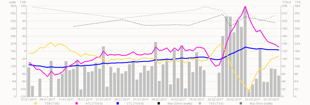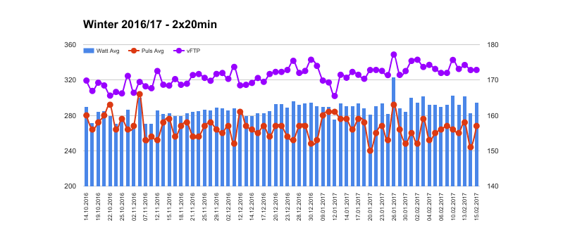 - Pacing – Langsamer anfangen: Bei langen Rennen geht es vorrangig darum mit den verfügbaren Energiequellen hauszuhalten. Das sind vor allem Kohlenhydrate und Wasser. Bei ~60g Kohlenhydrataufnahme pro Stunde (= 240kcal/h) und einer angenommenen Fettverbrennungsrate von 1g/min (= 540kcal/h) – was schon sehr hoch, aber nicht unrealistisch ist – ergibt sich bei einem Verbrauch von ~780kcal/h eine Bilanz von 0. Umgerechnet sind das etwa 210W am Pedal. Bei mir läuft bis ~270W die Fettverbrennung auf Maximalniveau. Darüber steigt das Laktat und beginnt die Fettverbrennung zu hemmen.