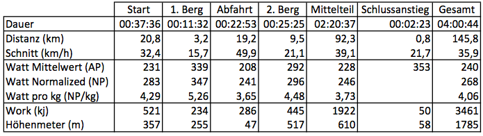 Das hat sich dann am Jaufen Pass gerächt. Unten rein ist es noch wunderbar gegangen. Ich bin mein geplantes Tempo mit Rund 240-260 Watt gefahren, als plötzlich knapp nach der Hälfte die Leistung binnen 10min auf 200W abgefallen ist. D.h. Kohlenhydratspeicher leer! Bis dahin bin ich ca. 4h:30min gefahren und hatte 3600kcal verbraucht. Zu mir genommen habe ich nur rund 700kcal KHs. Ergibt eine Differenz von 2900kcal. Zieht man noch die maximal 300kcal, die pro Stunde – bei optimaler Ausnutzung – aus der Fettverbrennung kommen können ab und berücksichtigt, dass am Kühtai kaum etwas aus der Fettverbrennung kam, da ich zu nahe an der Schwelle gefahren bin (= 3,5*300 + 0,5*300 = 1200kcal), dann bleiben noch 2900 – 1200 = 1700kcal. Das entspricht ziemlich genau den 400g KH’s bzw. 1600kcal, die der menschliche Körper speichern kann. Es war also „errechenbar“, dass ich mit der Fahrweise und Ernährung dort eingehen würde.