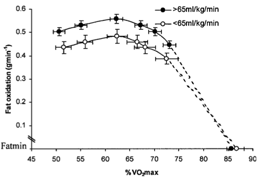 %VO2max korreliert im Berreich 65%-90% gut mit der HRR (= heart rate reserve = Maximalpuls – Ruhepuls). Für maximale Fettverbrennung müsste ich im Bereich 65% VO2max fahren. Das heisst 187 (Max. Puls) – 42 (Ruhepuls) = 145 * 0,65 = 94 + 42 (Ruhepuls) = 136 = L2 bzw. 200-220W.