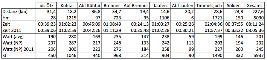 Obwohl ich mich schon um 6 Uhr im Startblock 2 angestellt habe (6:45 Startschuss), bin ich erst 7 min hinter den Ersten über die Startlinie gerollt. Hinunter nach Ötz ging es dann – eigentlich unerwartet – stressfrei, aber mit wesentlich mehr Energieaufwand als voriges Jahr im ersten Startblock und auch um 2 Minuten langsamen. Über das Kühtai dann im kräfteraubenden Slalom hoch, erst ab Ochsengarten wurde es etwas weniger verstopft und rhythmischer. Letztlich war es aber ein Fehler am Kühtai so schnell zu fahren, da die richtig guten Gruppen, die mich kräfteschonend und schnell auf den Brenner gebracht hätten, ohnehin nicht mehr erreichbar waren. Mit 1:02:23 war ich dort letztlich sogar etwas schneller als im Vorjahr und wäre – rechnet man den Slalom, die verstopften Strassen und etwas Windschatten ein – mit den gleichen Leistungswerten aber aus dem ersten Startblock gestartet, vermutlich gut vorne dabei gewesen.
