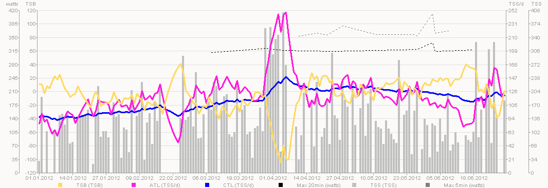 Auch die Zusammensetzung der TSS Punkte war im Winter etwas anders: Im Herbst habe ich mich an VO2max Intervallen versucht, danach bin ich viel in der „Fat-max“ Zone (= Bereich der absolut maximalen Fettverbrennung = 75-80% FTP) gefahren. Eigentlich keine Rennen auf der Rolle (das geht mit der Bushido Rolle nicht wirklich) und auch nur hin- und wieder Intervalle an der Schwelle. Im März dann allerdings, zum Abschluss der Rollensaison, doch noch 3 Wochen jeden 2. Tag ein Rennen (VCF – Spring Tour 2012).