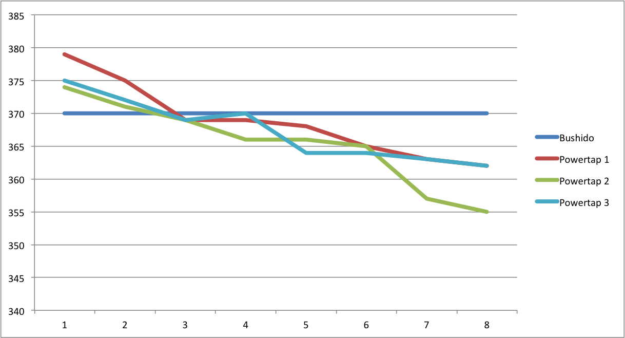 - Kalibriert man die Rolle mit der eingebauten Kalibrierungsfunktion, so hat sich bei mir eine Abweichung von rund 10W zu meinem Powertap ergeben – initial. Denn die Rolle unterliegt – wie fast alle Rollen und auch Leistungsmesser – einer massiven Temperaturdrift. Kalibrieren sollte man sowieso erst nach einer Aufwärmphase von ca. 20 Minuten, aber auch danach driftet die Rolle fest weiter. Unten ist ein Graph von einem Intervalltraining. Bushido ist auf 370W eingestellt. Die Powertap Linien stammen von der selben Einheit an unterschiedlichen Tagen. Vor den Intervallen wurden 20 Minuten aufgewärmt und das Powertap Rad davor genullt (Auto-Null). Einmal habe ich auch versucht den Powertap zwischen jedem Intervall neu zu Nullen (Manuelle Kalibrierung), das hat aber zum gleichen Ergebnis geführt. Fazit: Ohne das Firmware Update und einen gepairten Leistungsmesser ist ein wattgesteuertes Training nur begrenzt möglich. Man müsste die Intervalle in der TTS Software anpassen und spätere Wiederholungen mit höheren Wattzahlen fahren, um in der gewünschten Zone zu bleiben bzw. muss man bei längeren GA Einheiten immer wieder die Watt nach oben regulieren, damit der Puls dort bleibt wo er sollte.