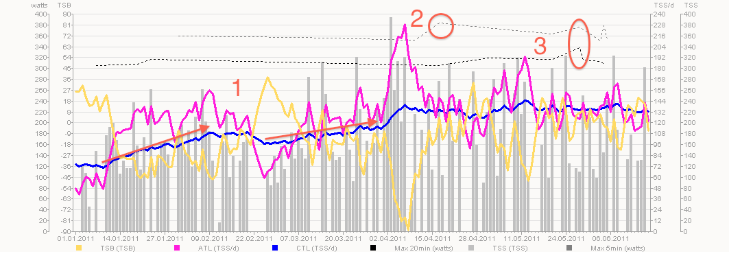 Die Literatur zu Training mit einem Powermeter empfiehlt, dass man seine CTL in der Grundlagenphase um 3-6 Punkte pro Woche erhöhen soll. Macht man es rascher, dann besteht Übertrainingsgefahr. Erhöht man um 3-4 pro Woche, dann kann man sich die sonst übliche Regenerationswoche sparen. Erhöht man um 6, dann braucht’s einen 3+1 oder 4+1 Rythmus, wobei sich durch den Rückfall der CTL in der Regenerationswoche erst wieder eine durchgerechnete Steigerung von rund 3-4/Woche ergibt. Abgesehen davon ist es ziemlich individuell wieviel Steigerung jeder verträgt.