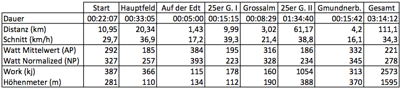 Anfangs des Schlussanstiegs änderte sich das aber sehr rasch. Zu meiner Verwunderung reihte ich mich recht weit vorne ein und konnte das Tempo gut über die Edt (370W Schnitt – nur 7 sek. langsamer als beim 1. Mal) und den Gmundnerberg, der steiler war als ich mir gedacht hatte – durchziehen und als 4. (U40) bzw. 6. (Gesamt) mit einem Rückstand von 1:50 Minuten auf den Sieger Hans-Peter Obwaller die Ziellinie überqueren (Ergebnisliste als PDF).