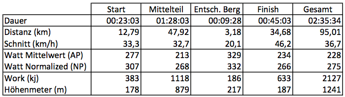 Gestartet wurde zuerst die Elite und mit 5 Minuten Abstand die Amateure & nicht Lizenzierten zusammen. Von Anfang an ging es gleich ordentlich zur Sache so dass auf den ersten 20min ca. 330 Watt NP notwendig waren um mit der vordersten Gruppe mitzuhalten. Das ist mir auf dem ersten Berg hinauf auf Anhieb gelungen. Oben wurde dann allerdings das Rennen für ca. 5min gestoppt, da aufgrund des schnellen Anfangstempos die Elite eingeholt war und die Rennleitung wieder etwas mehr Abstand zwischen die beiden Felder bringen wollte.