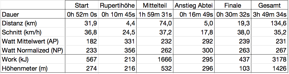 Um’s kurz zu machen: Zu fahren waren 4 Runden zu je 40km. Bei Donnerskirchen und Kaisersteinbruch ging’s jeweils über das Leithagebirge. Habe am ersten Anstieg in Donnerskirchen die Spitzengruppe von ca. 10 Fahrern nicht halten können und mich in die 2. Gruppe mit ca. 20 Fahrern eingereiht. Dort dann bis zur 3. Runde mitgerollt. Nachdem Anfang der 3. Runde offenbar keiner mehr so richtig fahren wollte, habe ich das übernommen und bin fast 50km alleine vorne im Wind gefahren. War klar, dass es dem Gesamtergebnis nicht sehr zuträglich ist, aber immerhin ein netter Test, wie lange ich’s durchhalte und wann ich wohl eingehen werde. Das ist dann in der 4. Runde ca. 10km vor dem Ziel beim letzten Anstieg in Kaisersteinbruch passiert. Bin daher nur vorletzter in der Gruppe geworden (= Platz 31). Ergebnis war aber onehin sekundär. Ging viel mehr darum einmal 160km in Renntempo zu fahren und einen Hungerast zu erleben 🙂