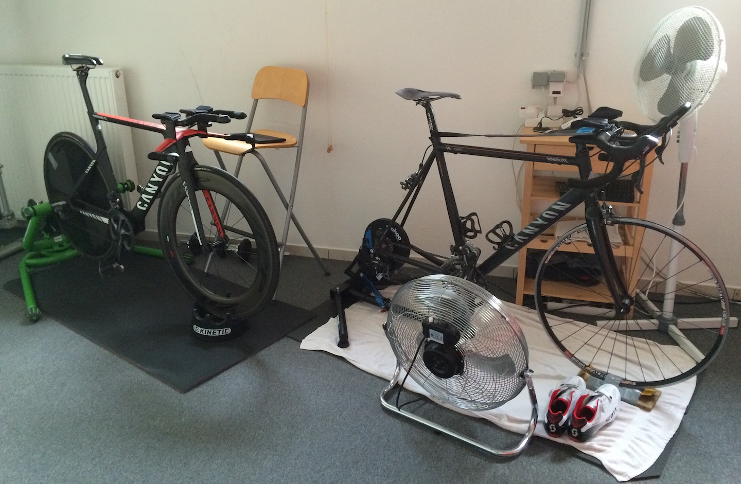 Neu hinzugekommen ist ein Kurt Kinetic Rock and Roll Trainer mit extra Schwungscheibe und In-Ride Leistungsmessystem, der mir als Testgerät zur Verfügung gestellt wird und auf dem ich gelegentlich Einheiten mit dem Zeitfahrrad absolvieren möchte.
