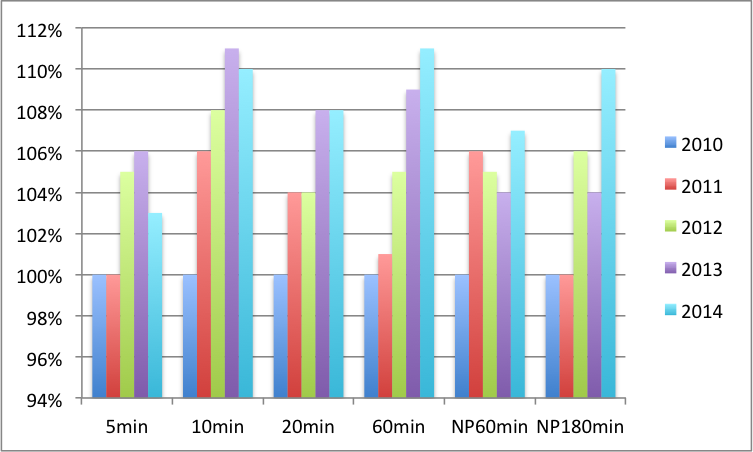 Bevor es an den 2015er Plan geht, ein Rückblick wie sich der 2014er Plan, den ich in den dazugehörigen Postings „Auf der Rolle 2014 Teil 1, Teil 2, Teil 3“ beschrieben habe, auf meine Leistungswerte in dieser Saison ausgewirkt hat: